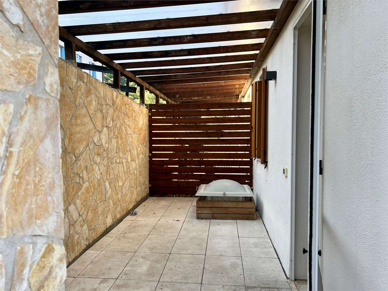 All’esterno, la proprietà dispone di due garage singoli di 13 mq ciascuno al piano interrato, un posto auto e area esterna parzialmente terrazzata e parzialmente con giardino in pendenza di 70 mq.