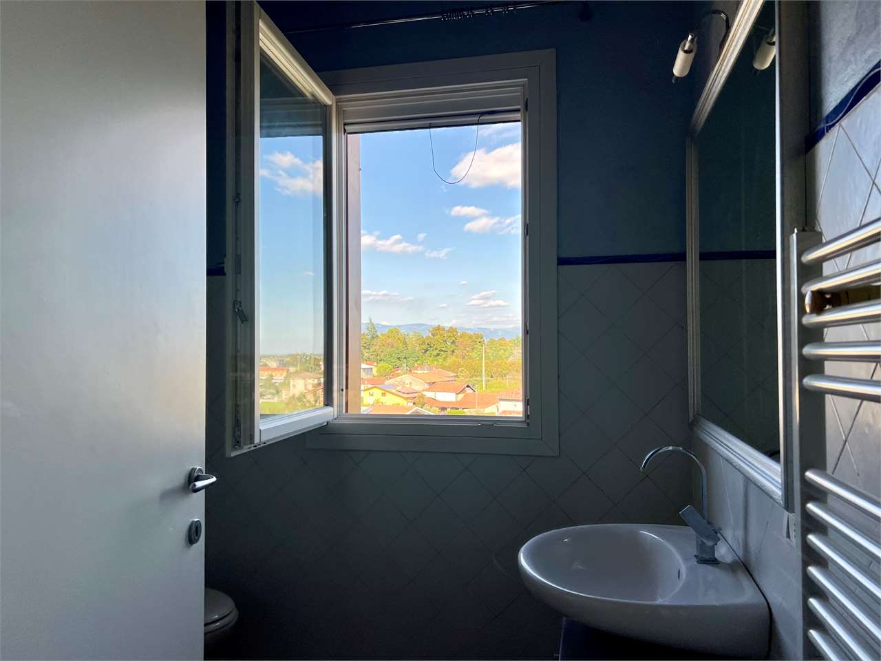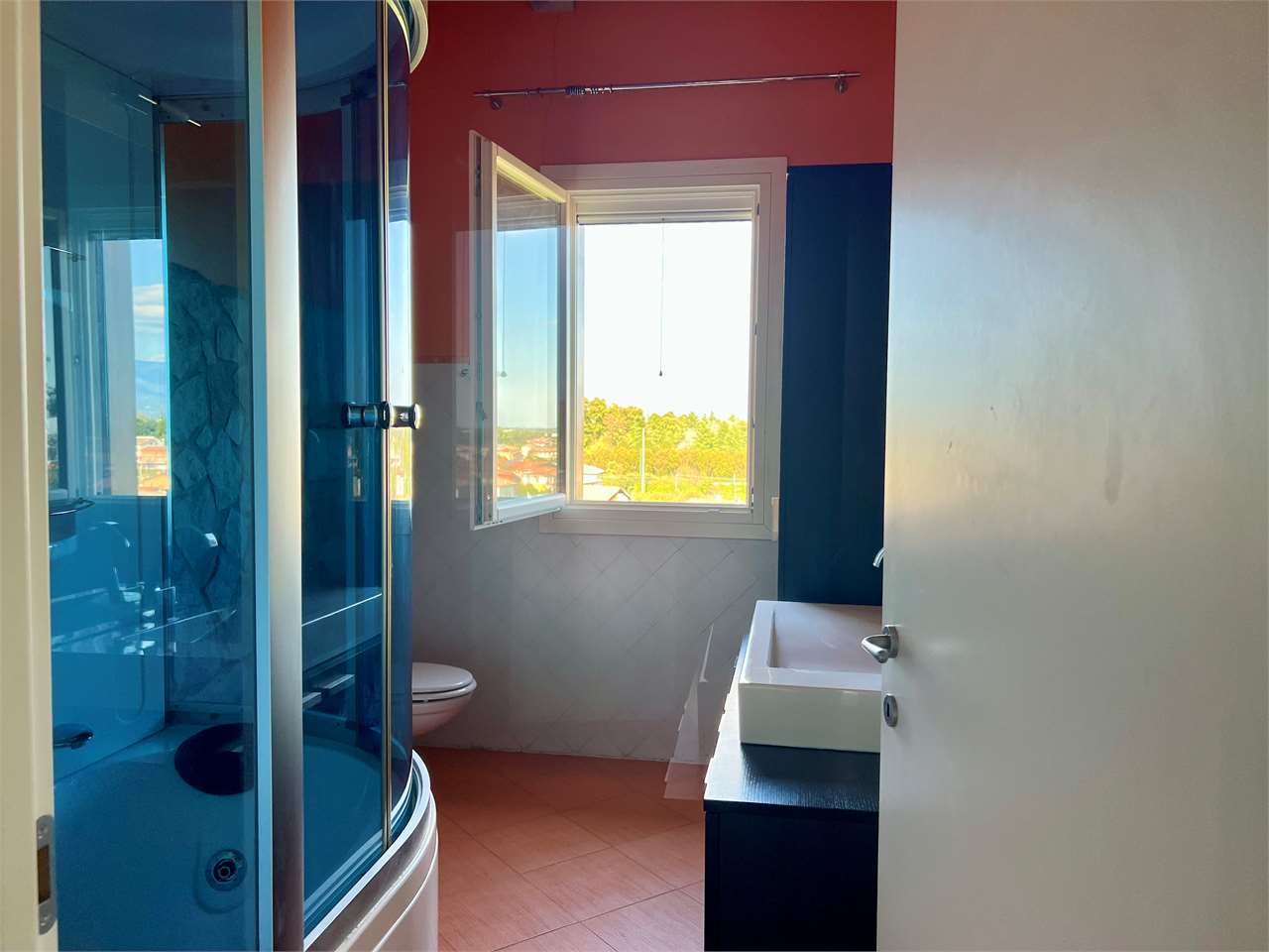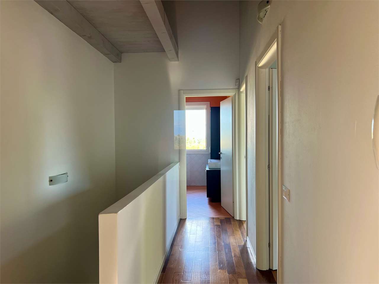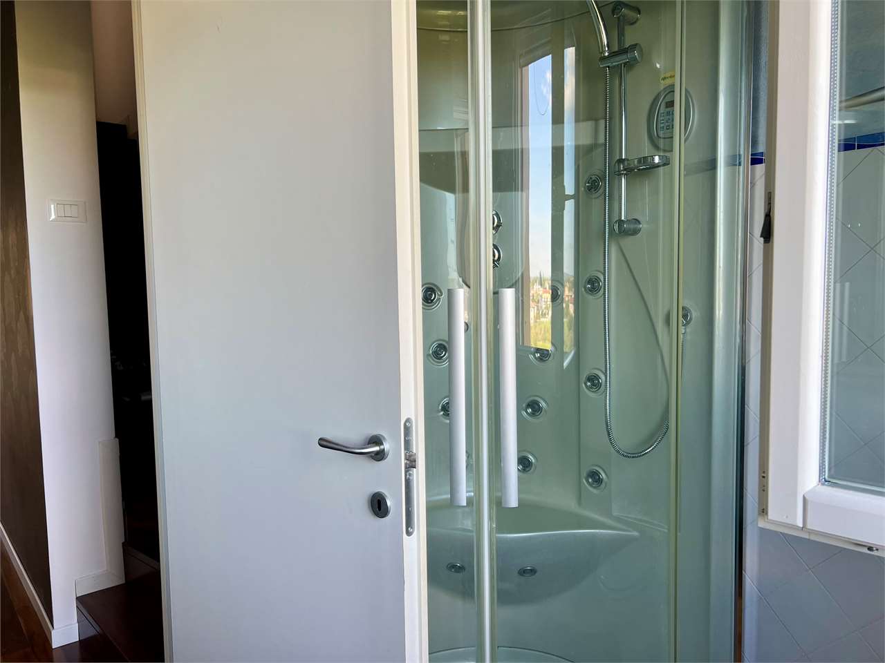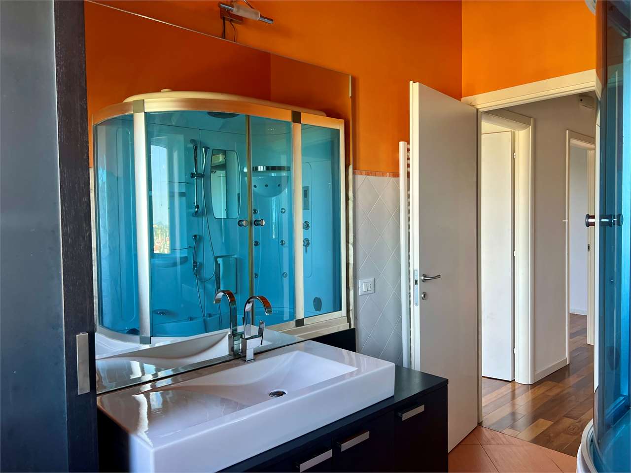 Salendo al piano primo, la zona notte si compone di tre camere da letto, la matrimoniale di 16 mq, la doppia di 12 mq e la singola di 9 mq. Il bagno principale di 6 mq è curato nei dettagli e dotato sia di vasca che di doccia idromassaggio, offrendo un ambiente raffinato e rilassante.