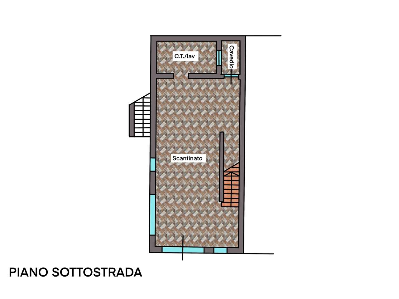 Al piano sotto strada, accessibile sia dall’interno che direttamente dall’area esterna, troviamo un’ampia taverna di circa 50 mq, un servizio di 7 mq e un cavedio di 2 mq.