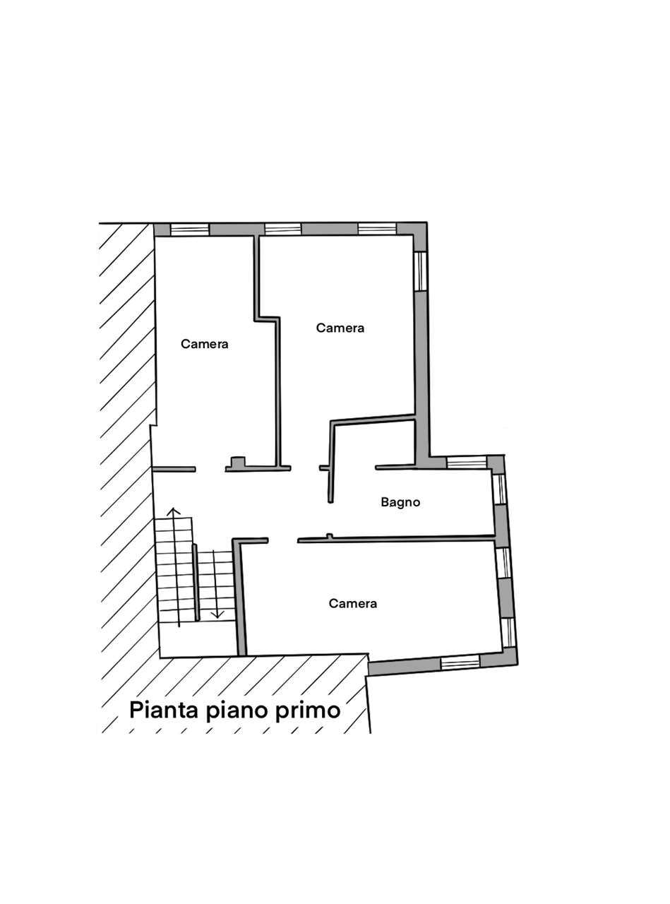 – al piano primo tre camere di 16, 17 e 18 mq, bagno di 9 mq dotato di vasca e doccia;